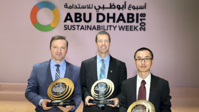 Left to right, Dr Ali Abshaev, Prof Eric Frew and Dr Lulin Xue with their awards at the UAE Research Programme for Rain Enhancement Science at Abu Dhabi National Exhibition Centre