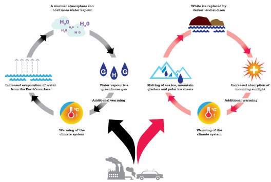 The white ice sheet surfaces decrease in area and less solar energy is reflected into space.